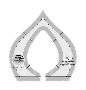 - Inspired by the dome of the Taj Mahal, Taj is perfect for quilting curvy, pointed arcs on your quilts. This versatile tool can be used in all areas of your quilt, including borders, blocks and backgrounds. Designed by machine quilting teacher and author, Angela Walters, this tool does double duty! Quilt along the outside to create: - Pointed arches in borders - Overlapping arcs - Rotate to quilt complex looking motifs Work along the inside of the tool to create: - A leafy allover design - Leaves in a row for thinner borders - Rotate to quilt flower-like motifs for blocks By combining the inside and outside, or alternating directions, you can come up with endless quilting possibilities. Features: - Creative Grids Grip to ensure the tool doesn’t slip while quilting. - Black and white dashed guide lines are visible on all fabric colors. - Palm-sized tool allows you to keep control, helping prevent broken needles and crooked lines. - Curved edges allow for versatile designs. - Works for longarm as well as home sewing machines. Total Size - 3-3/4in x 4in.